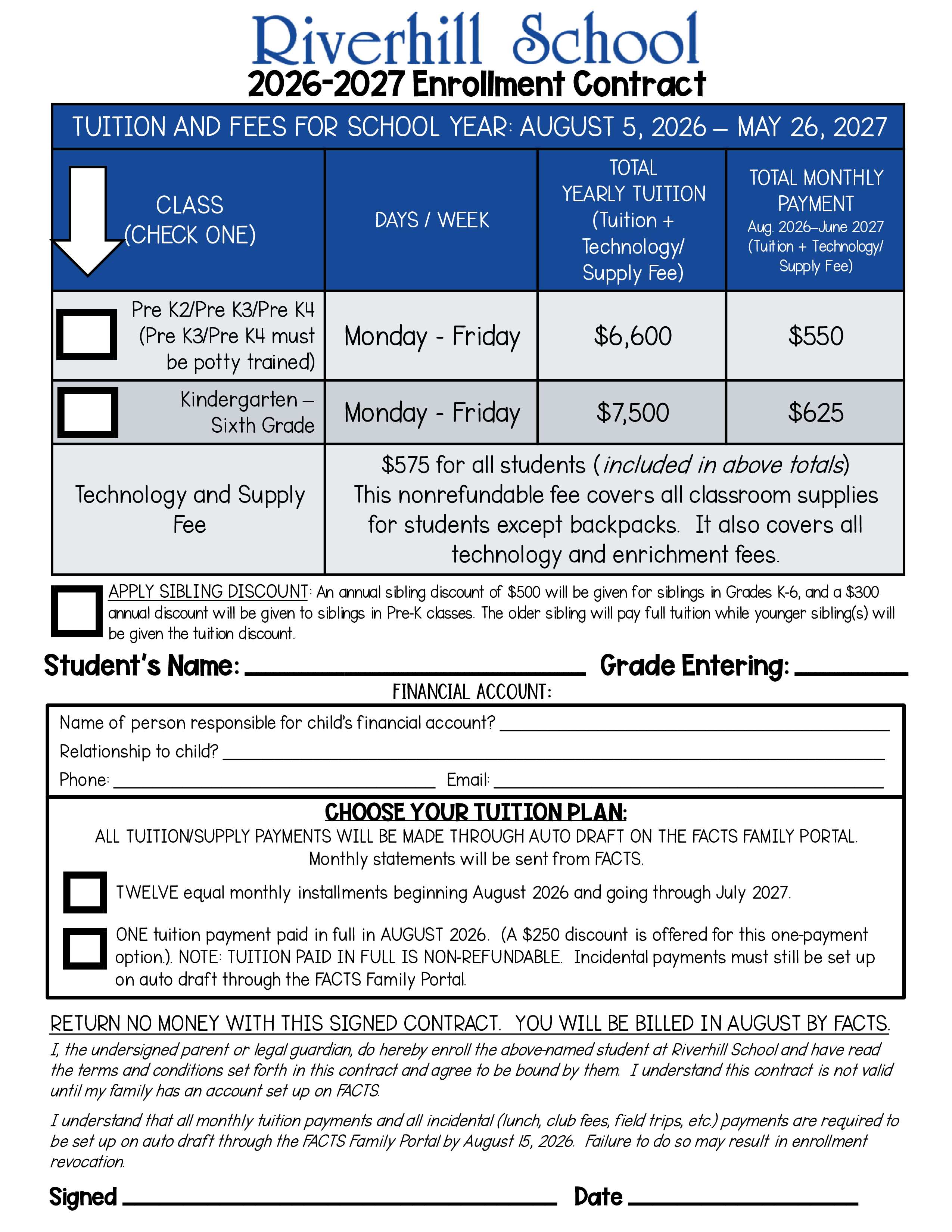 Applicants are welcome for all grade levels. Call (256) 764-8200 during regular business hours to request information and an application or download one from our website. The completed application with the $100 application fee must be submitted before enrollment is considered. For older students, it is helpful to submit current report cards or testing data. Upon acceptance, in the case of a transfer, Riverhill will request the required transcripts from the former school. Applicants will be tested by the Principal during a scheduled visit to the school.