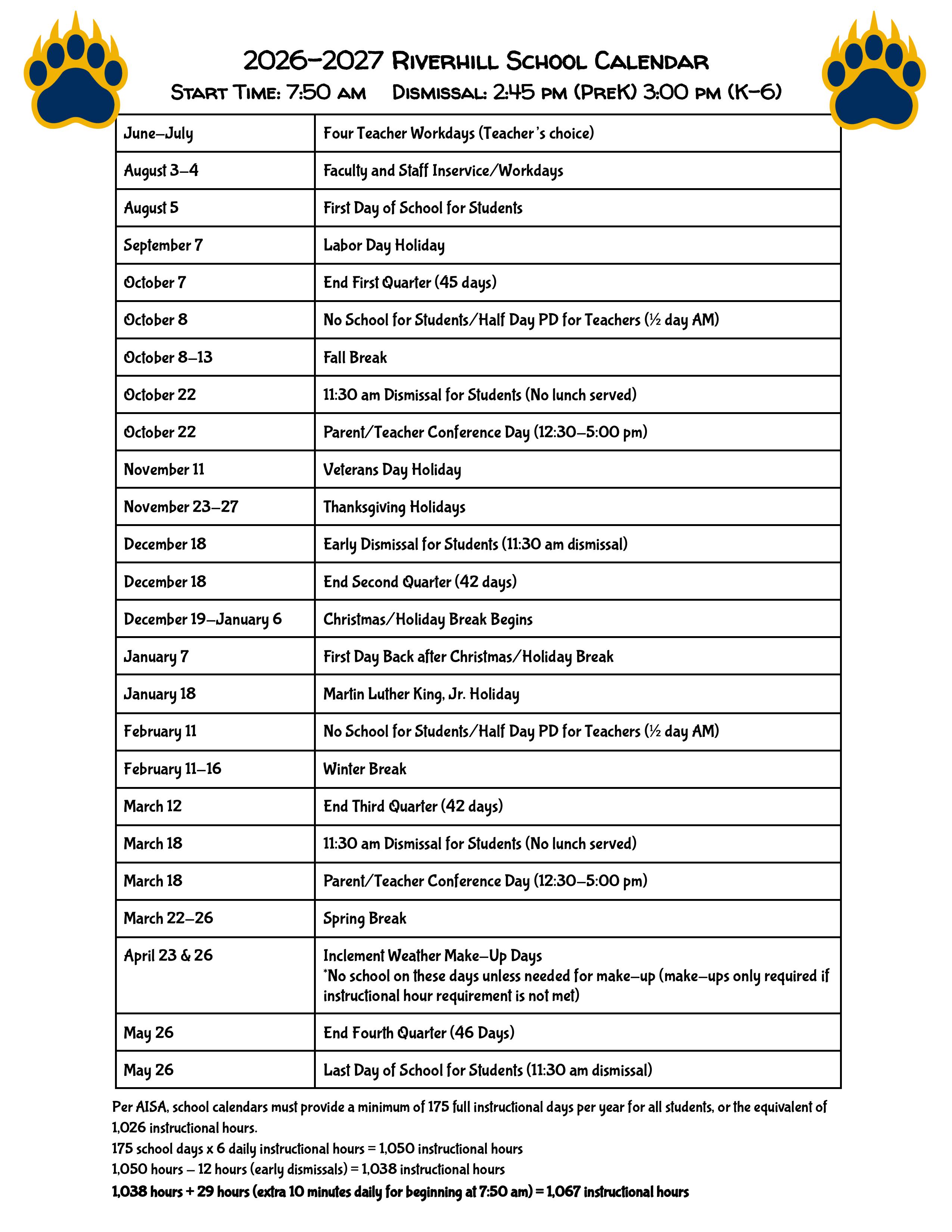 Calendar at a Glance Drop-Off Begins 7:40 a.m. | Start Time: 7:50 a.m. | Tardy: 8:06 a.m. | Dismissal: 2:45 p.m. (Pre K); 3:00 p.m. (K-6th)