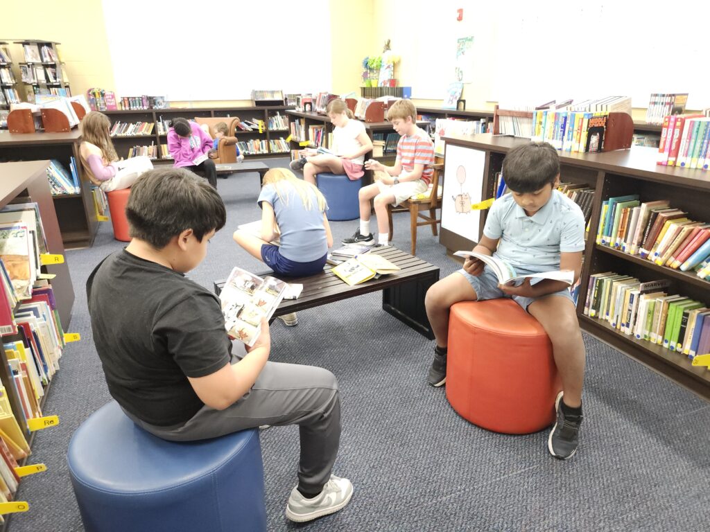 Students visit the library weekly to enjoy a literary learning experience. Our librarian models reading each week with a book showcase. The students from PreK all the way to 6th grade gain knowledge from the exciting selections. The older students also have time for Accelerated Reader testing and book selection to meet their classroom goals.