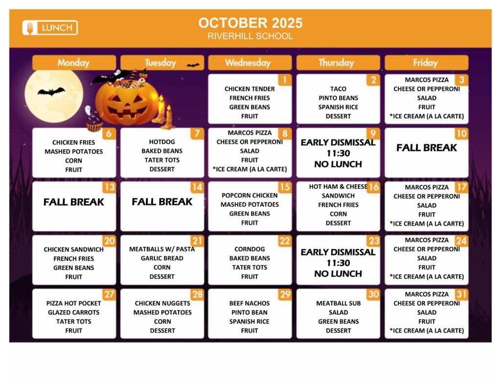 Riverhill School’s Lunch Program is a unique culinary experience for Riverhill Students! Riverhill’s Cafeteria Manager Lilly Cole works each day to make lunchtime a special treat for all staff and students. A “hot” lunch is offered each day and changes daily. A few of the most popular “hot” lunches are Chicken Tenders, Lasagna, Chicken Fettuccine Alfredo, Chicken and Rice, and Meatball Sub Sandwiches. A Baked Potato and Salad Bar is a daily choice in Riverhill’s Lunchroom and so are four different sack lunches. No fried foods are served and water and milk are the only drink options. Students let their teachers know their lunch choice each morning; of course, students also occasionally bring lunch from home. A Monthly Menu is sent home at the first of each month. Riverhill’s Lunchroom truly offers something for everyone!